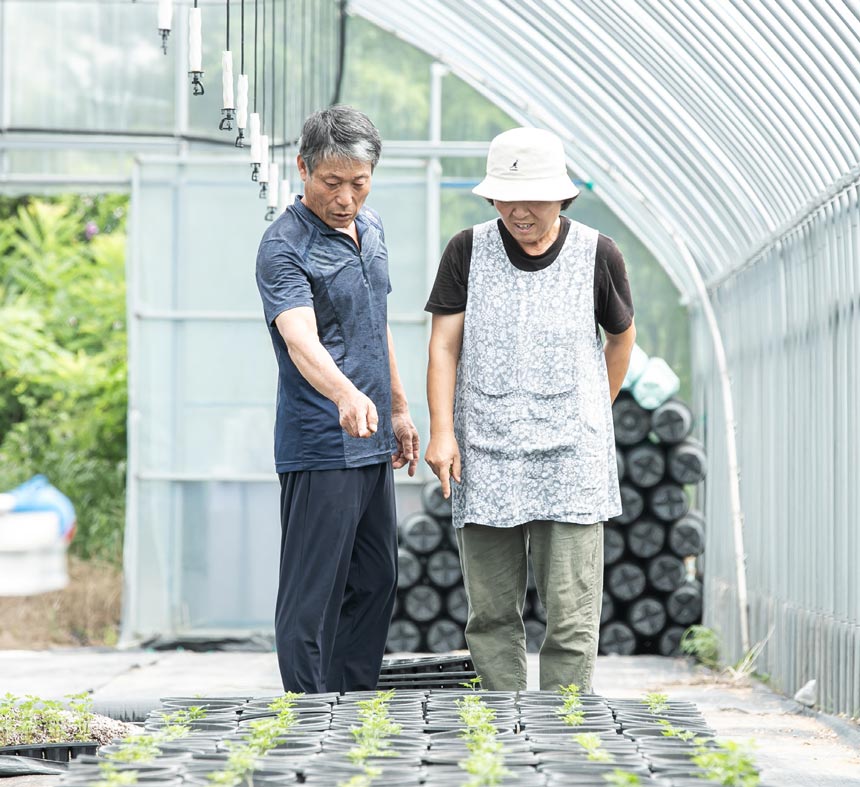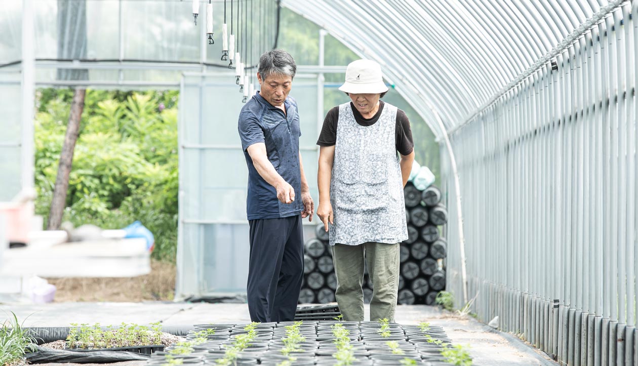 세종시 전의면에 자리한 정가목원. 정성윤, 이오영 대표가 환하게 맞아준다. 하우스 안에 들어서자 삽목을 마친 국화들이 정갈하게 줄지어 자라고 있다. 모두 한수정 지역상생사업 농가육성프로그램의 멘토로 활동하며, 멘티 농가들과 함께 심은 것들이다.